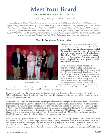 Nancy Russell Hutchinson ’56 joined the board as a 1-year term member in 2005 but continued through 2013. Nancy was a